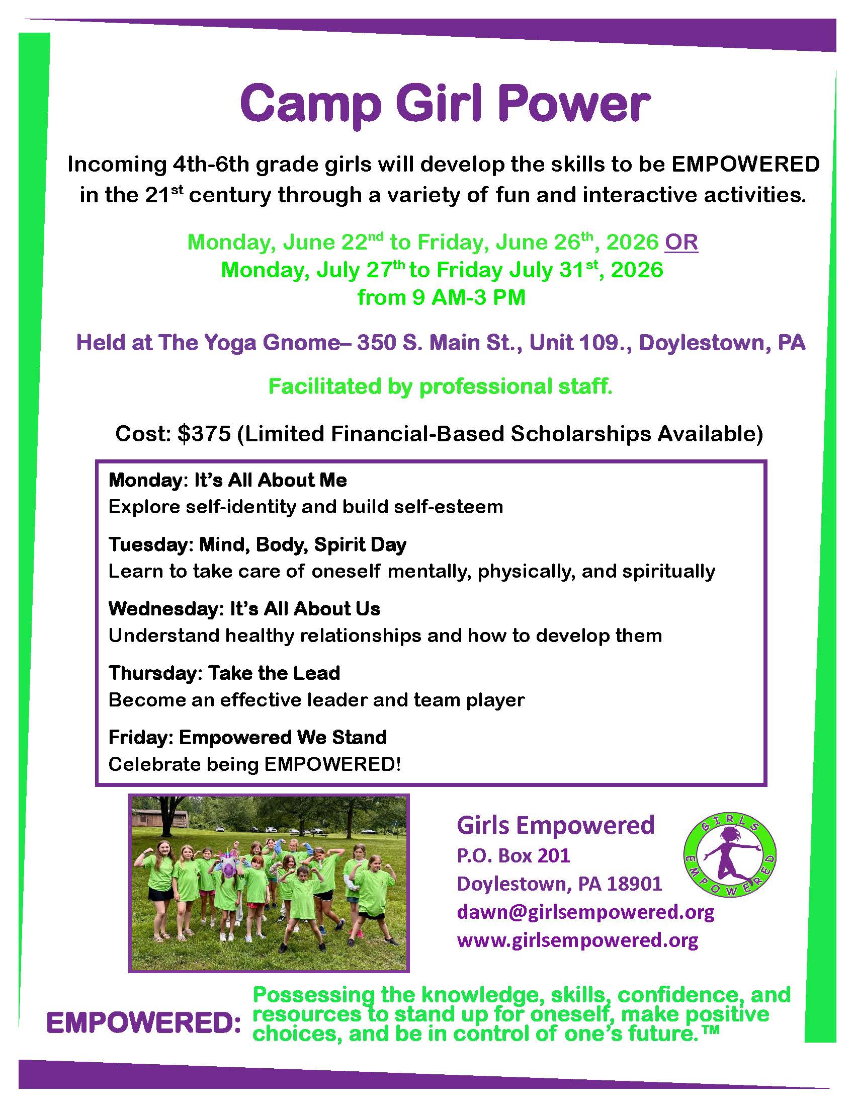 At Camp Girl Power, girls will develop the skills to be EMPOWERED in the 21st century through a variety of fun and interactive activities.